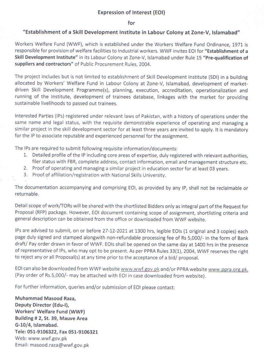 Expression of Interest: “Establishment of a Skill Development Institute in Labour Colony at Zone-V, Islamabad”