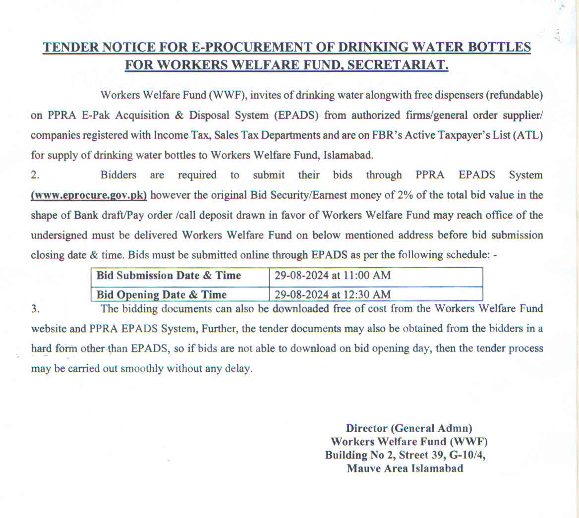 Tender Notice for e-Procurement of Drinking Water Bottles for Workers Welfare Fund, Secretariat