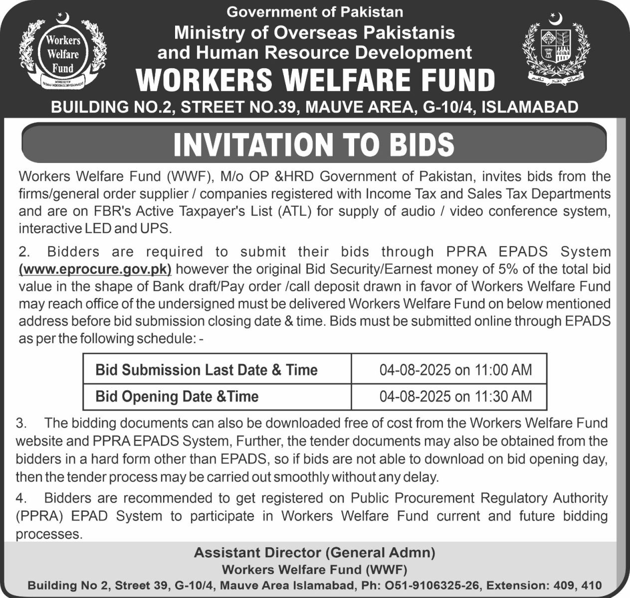 Tender for supply and installation of UPS, Audio / Video Conference System & Interactive LEDs - Workers Welfare Fund