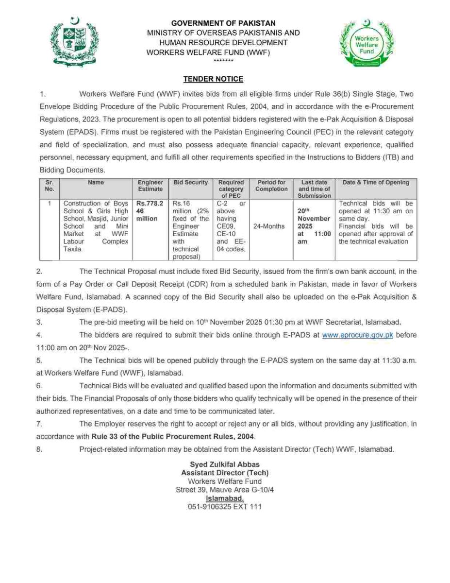 Construction of Boys School & Girls High School, Masjid, Junior School and Mini Market at WWF Labour Complex Taxila.